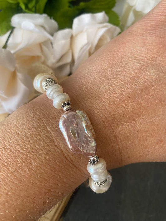 White and cream Baroque Pearl Beads, Natural Freshwater Shape Pearls and silver metal.