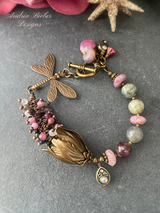 Watermelon tourmaline gemstone, dragonfly, charm bracelet