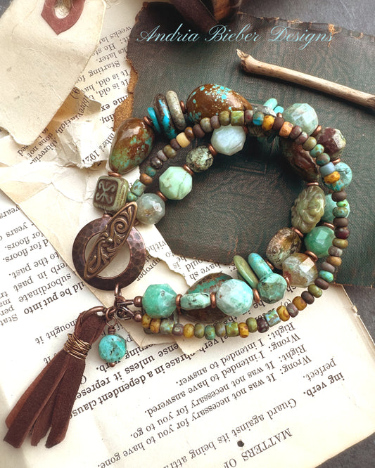 Turquoise, Amazonite, Chrysoprase stone, Czech glass, copper, leather, bracelet