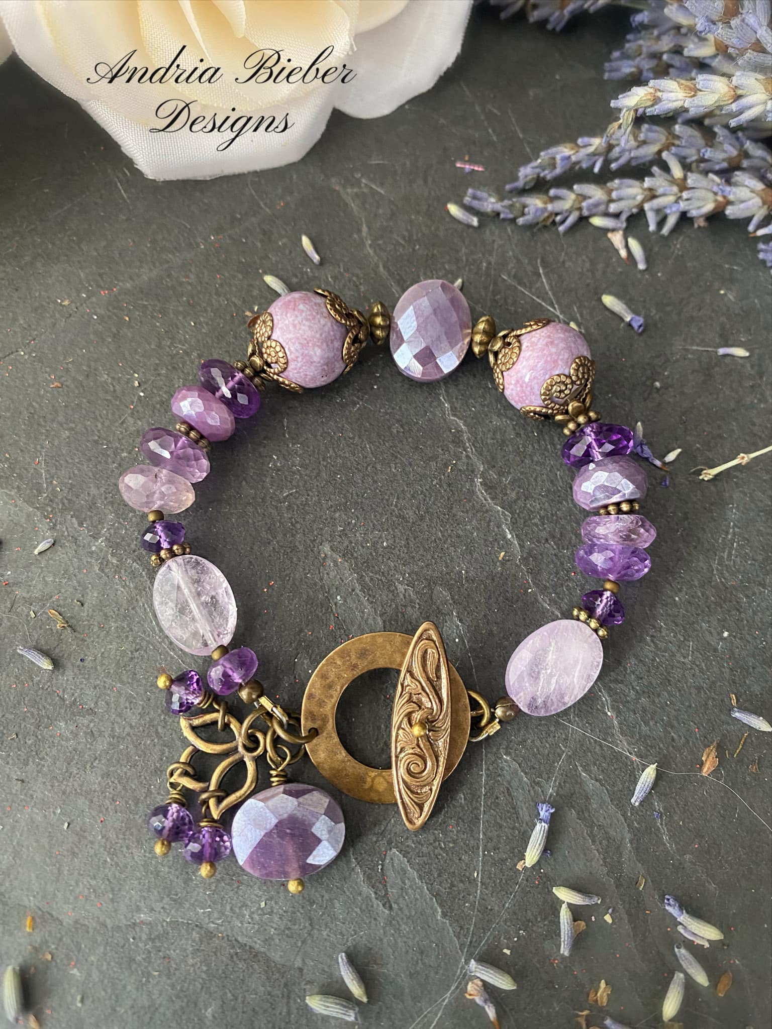 Mixed gemstone, pearl, handmade lampwork glass, handmade art clasp, bracelet