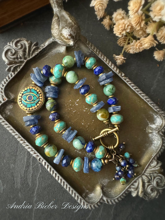 Azurite, kyanite, Turquoise stone, lapis lazuli stone, nepal beads, Czech glass, brass metal bracelet.