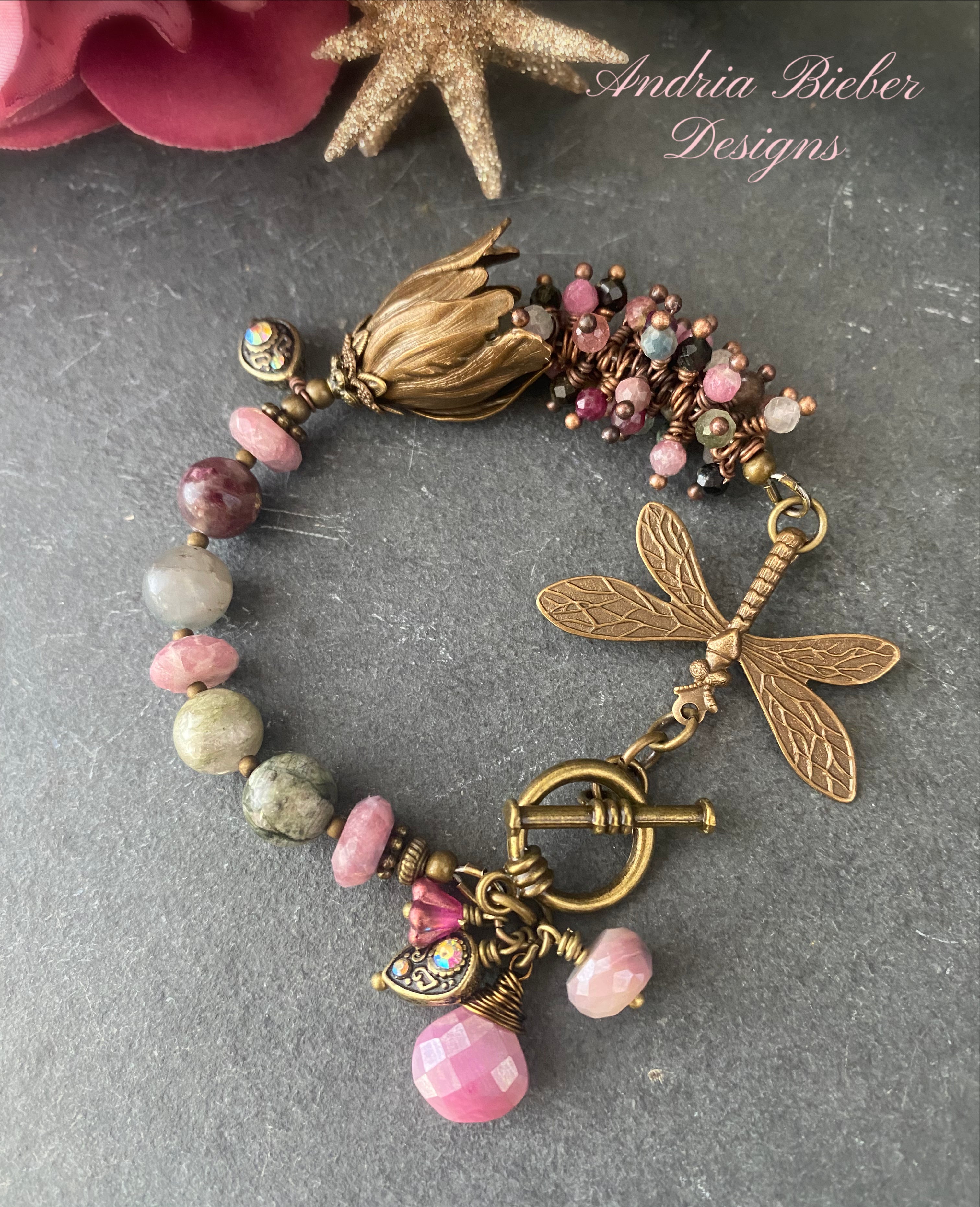 Watermelon tourmaline gemstone, dragonfly, charm bracelet