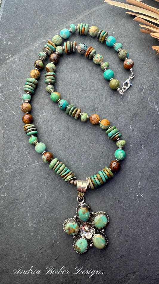 Hubei turquoise, Czech glass, African silver, and large Hubei turquoise flower pendant. MTO.
