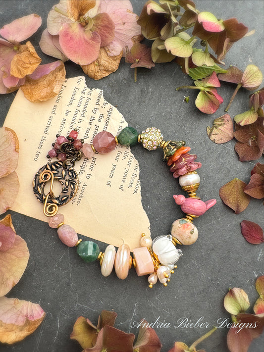 Mixed gemstone, pearl, handmade lampwork glass, handmade art clasp, bracelet
