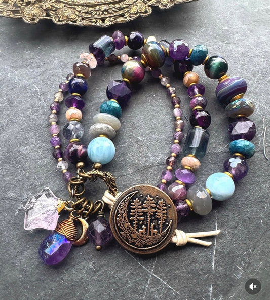 handmade lampwork glass, AB coated labradorite, fluorite, rainbow tigers eye, amethyst, aquamarine, purple tiger eye, moonstone, apatite, and beautiful handmade button clasp.