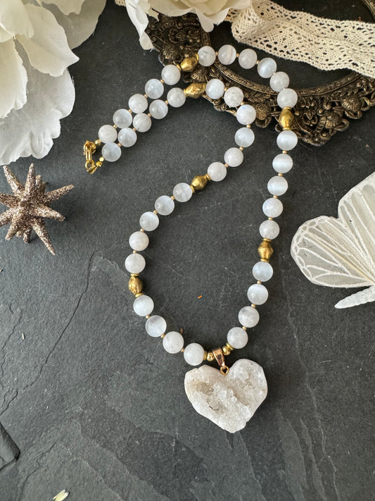 (Moonstone, selenite stone, heart druzy pendant, brass metal, necklace