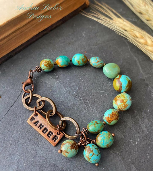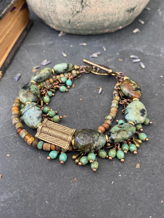 African turquoise stone, African brass, chain, multi strand, bracelet.