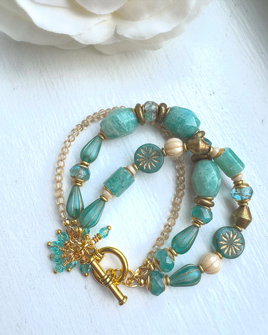 Amazonite, Czech glass, bronze metal, bracelet, jewelry