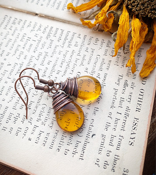 Amber teardrop Czech glass and copper wire wrapped earrings.