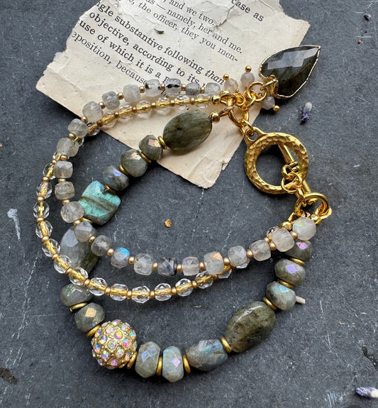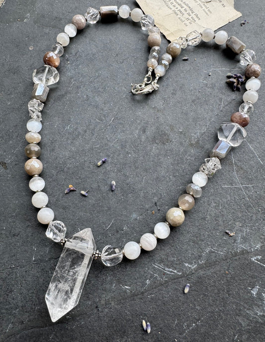 Labradorite stone, clear quartz, moonstone, crystal pendant, sterling silver metal, necklace.