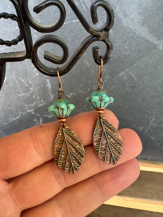 Handmade copper detailed charms, teal Czech glass, copper earrings