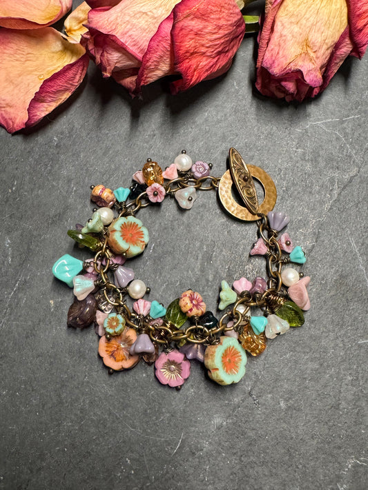 Mixed color flower bracelet. Pearls, Czech glass, bronze metal bracelet.