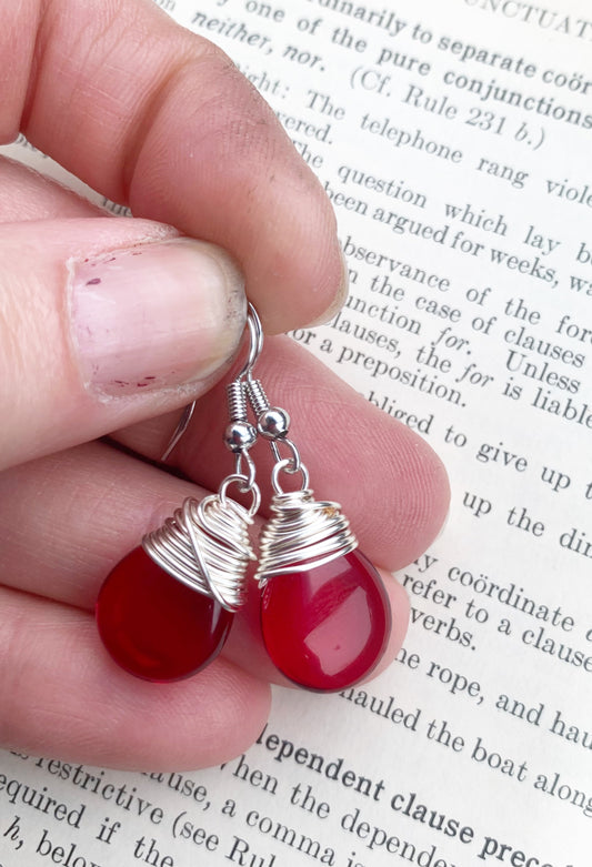 Red transparent teardrop Czech glass and silver wire wrapped, sterling silver earrings.