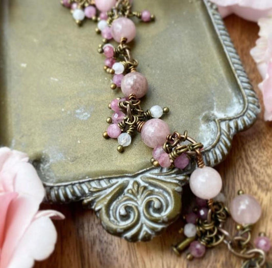 Rose quartz pink stone, Tourmaline pink stone, moonstone, wire wrapped, bronze metal bracelet.
