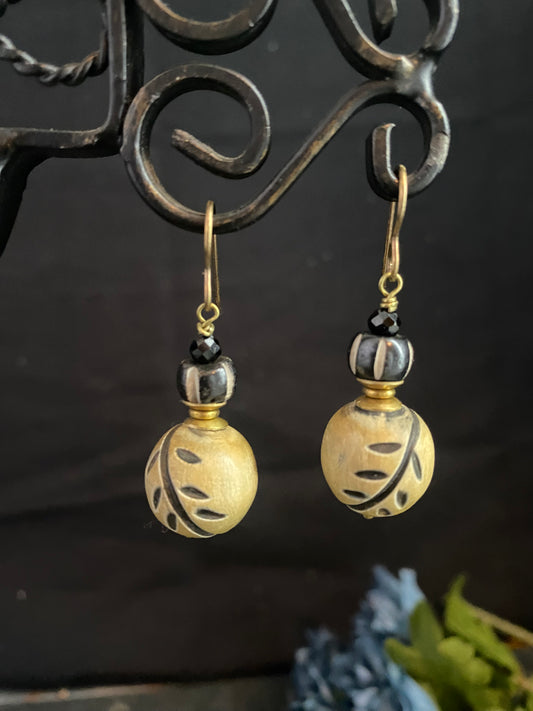 Wood leaf beads, black onyx stone, and bronze metal earrings.