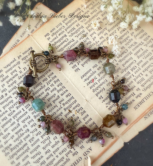 Watermelon tourmaline stone, wire wrapped, bronze metal bracelet.