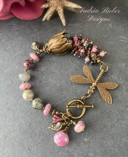 Watermelon tourmaline gemstone, dragonfly, charm bracelet, KIT