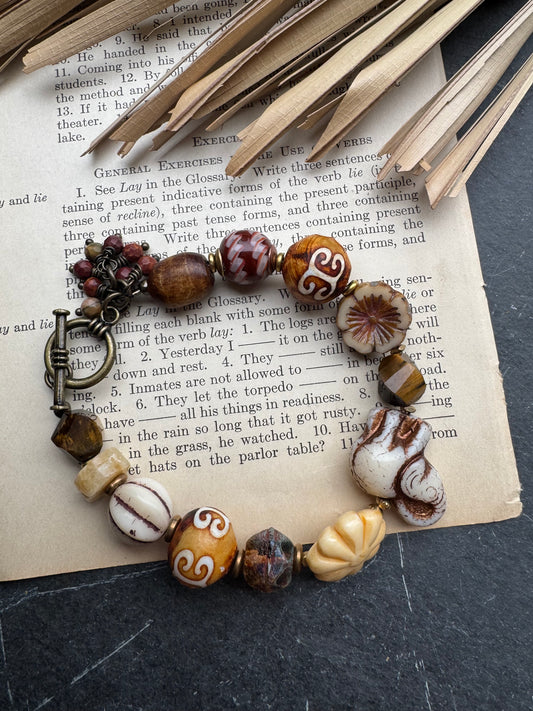White Elephant. czech glass, African glass, Amazonite, wood, bone, tiger eye stone.
