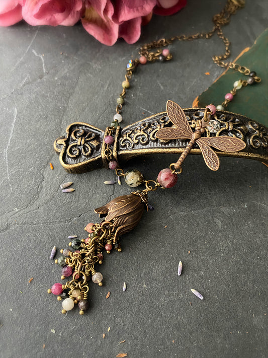 Watermelon tourmaline gemstone, dragonfly, flower, necklace, jewelry