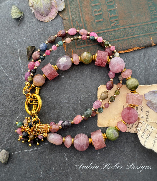 Watermelon tourmaline stone, rose quartz, strawberry quartz, hematite, gold metal, bracelet.