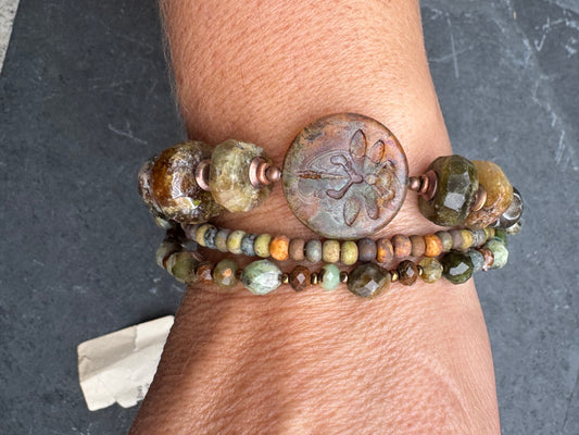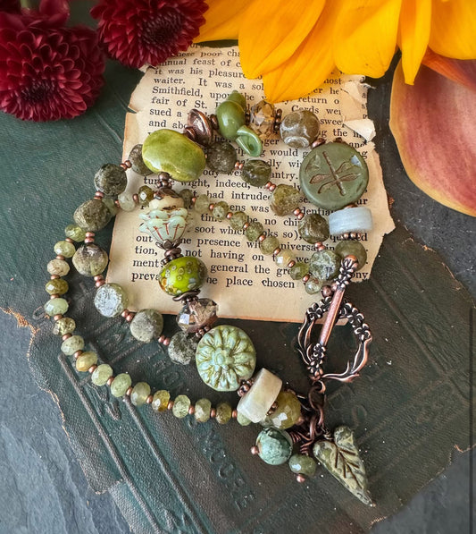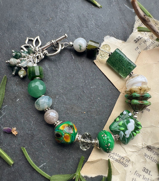 Green gemstone, Czech glass, lampwork glass, ceramic, copper metal, bracelet.