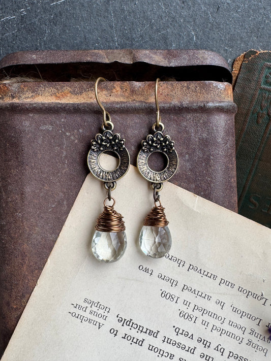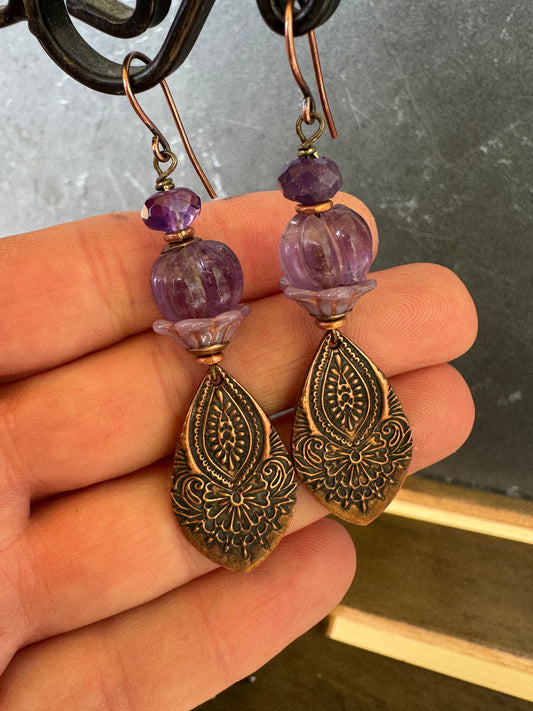 Handmade copper detailed charms, amethyst stone, czech glass, copper earrings