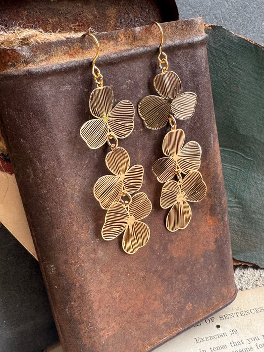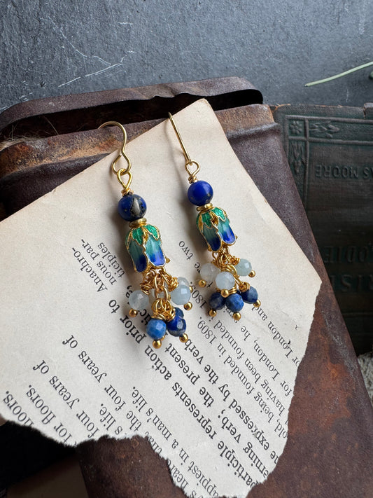 Gold flower charms, aquamarine, lapis stone, Cloisonné beads, earrings