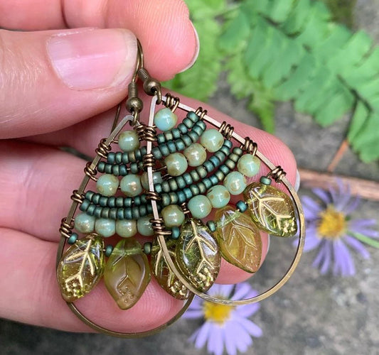 Green Czech glass leaves. Bronze metal hoops, wire wrapped, earrings