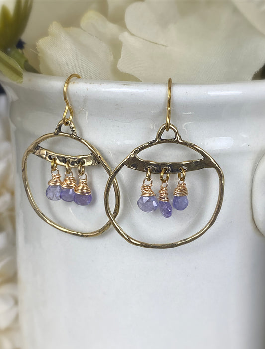 Gold hammered hoops, Iolite stone, earrings, jewelry