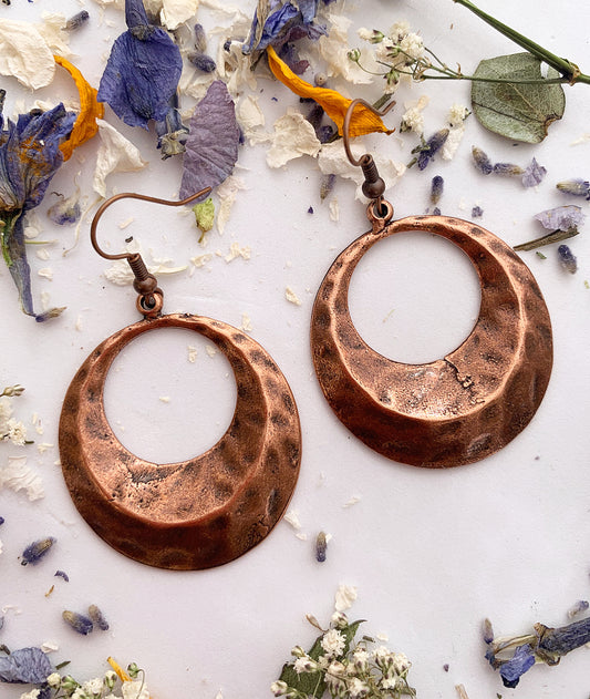 Hammered copper hoops. copper metal, earrings, jewelry.