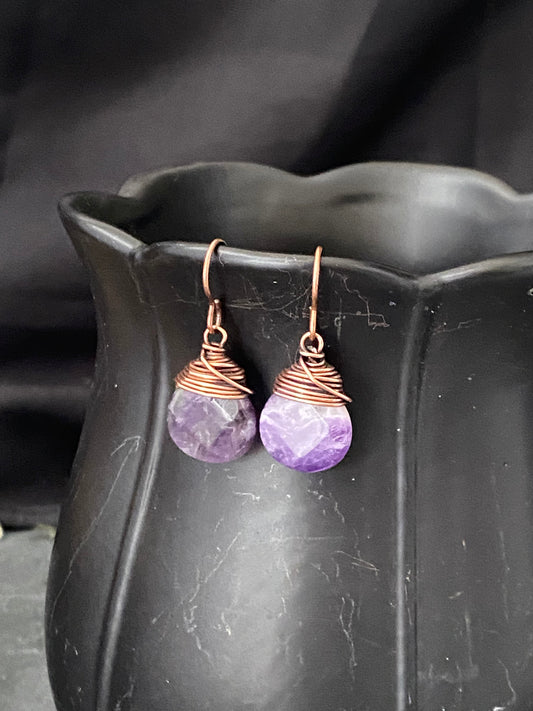 Amethyst gemstone drops, copper metal earrings, jewelry.
