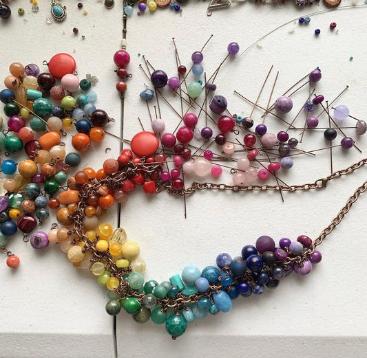 Layers. mixed gemstones, leather, copper metal, necklace, jewelry