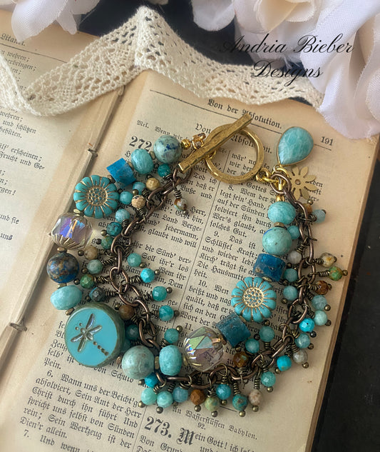 Amazonite, Hubei Turquoise, Azurite, Apatite, Czech glass, chain, multi strand, bracelet.