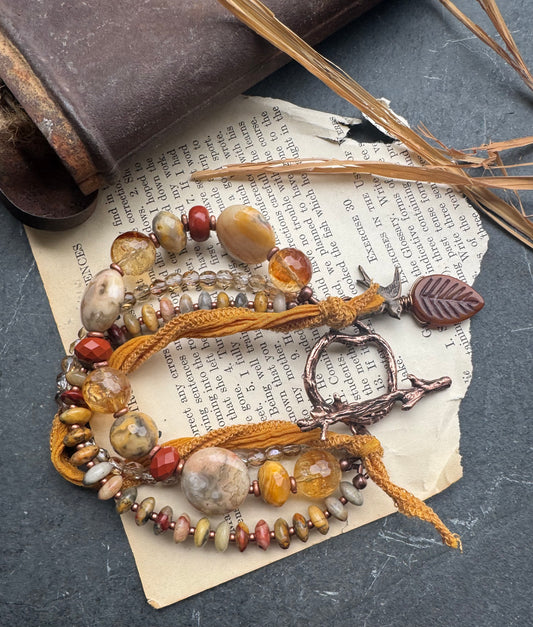 Amber, crazy lace agate, citrine, Czech glass, silk ribbon, copper, bracelet. Message ring says dream.