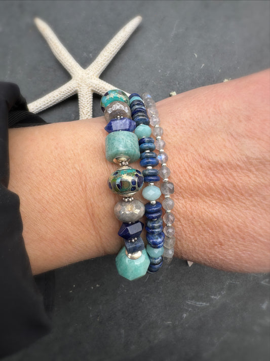 handmade lampwork glass, lapis, Amazonite, labradorite, sodalite, dumortierite stone with silver metal.