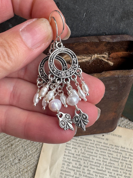 Paisley drops. Filigree, floral, Sterling silver hoop earrings, jewelry.