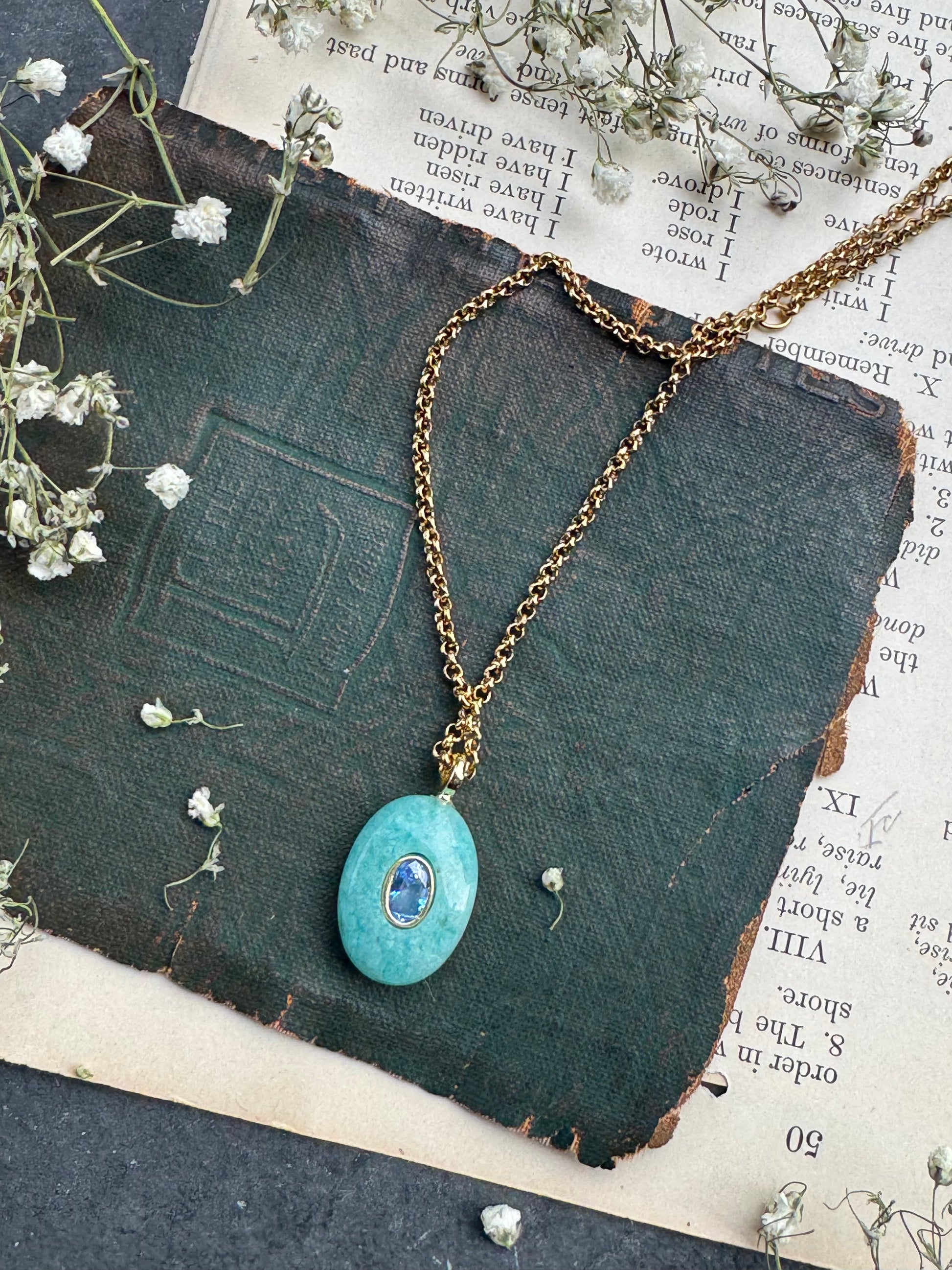 Amazonite, apatite, crystal, gold metal, drop necklace