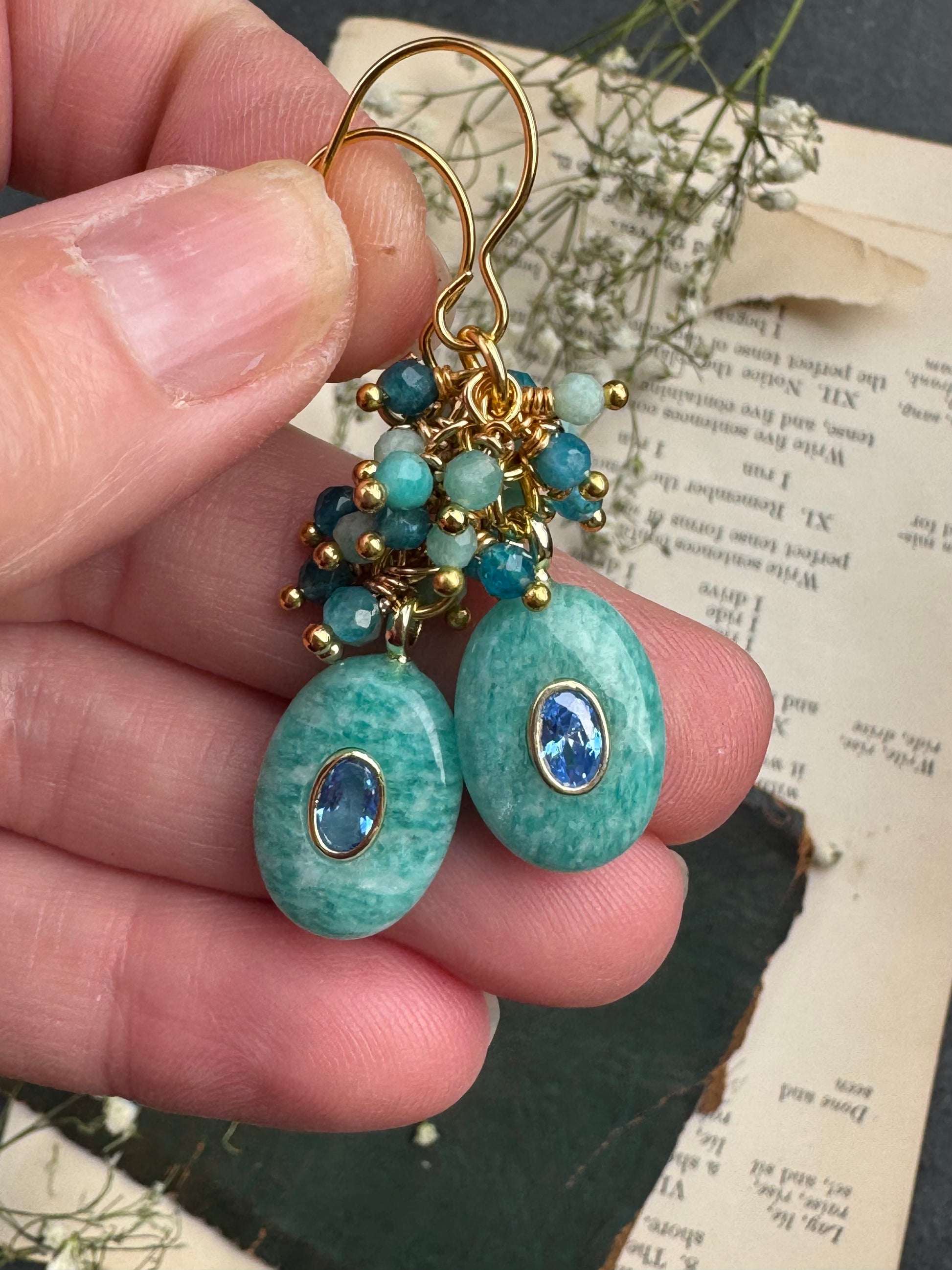 Amazonite, apatite, crystal, gold metal, drop earrings