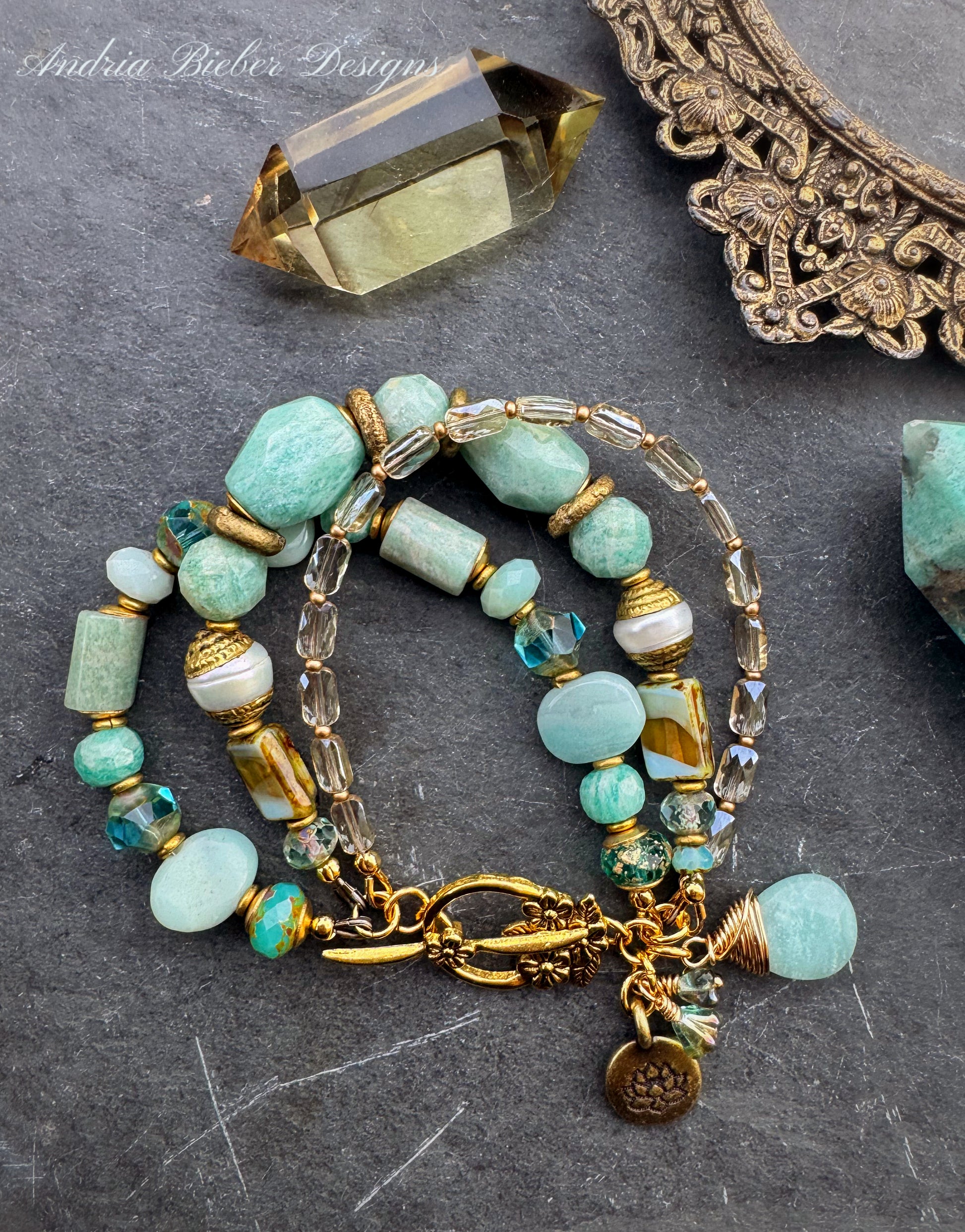 Amazonite, Czech glass, crystal, brass metal, bracelet, jewelry