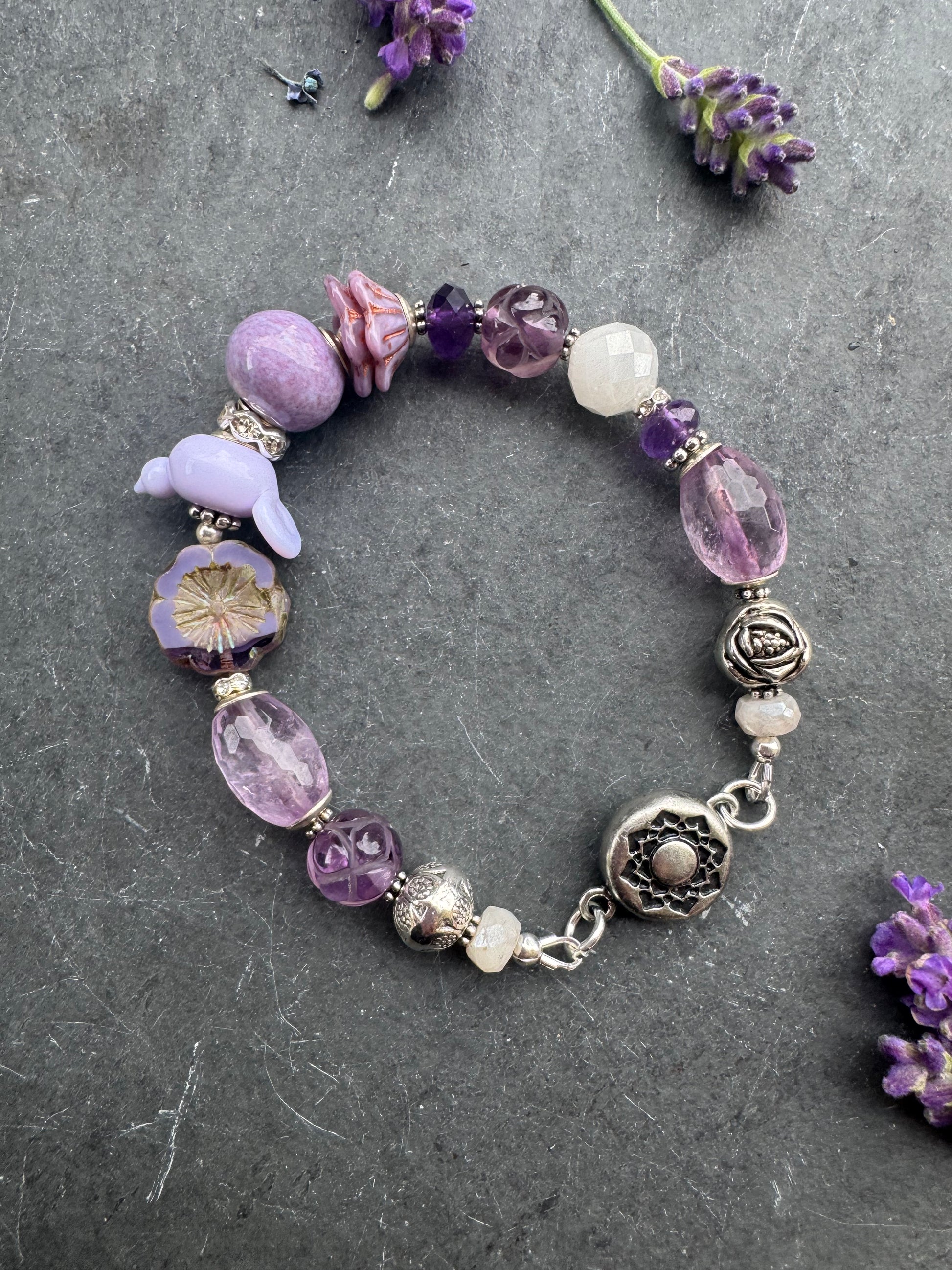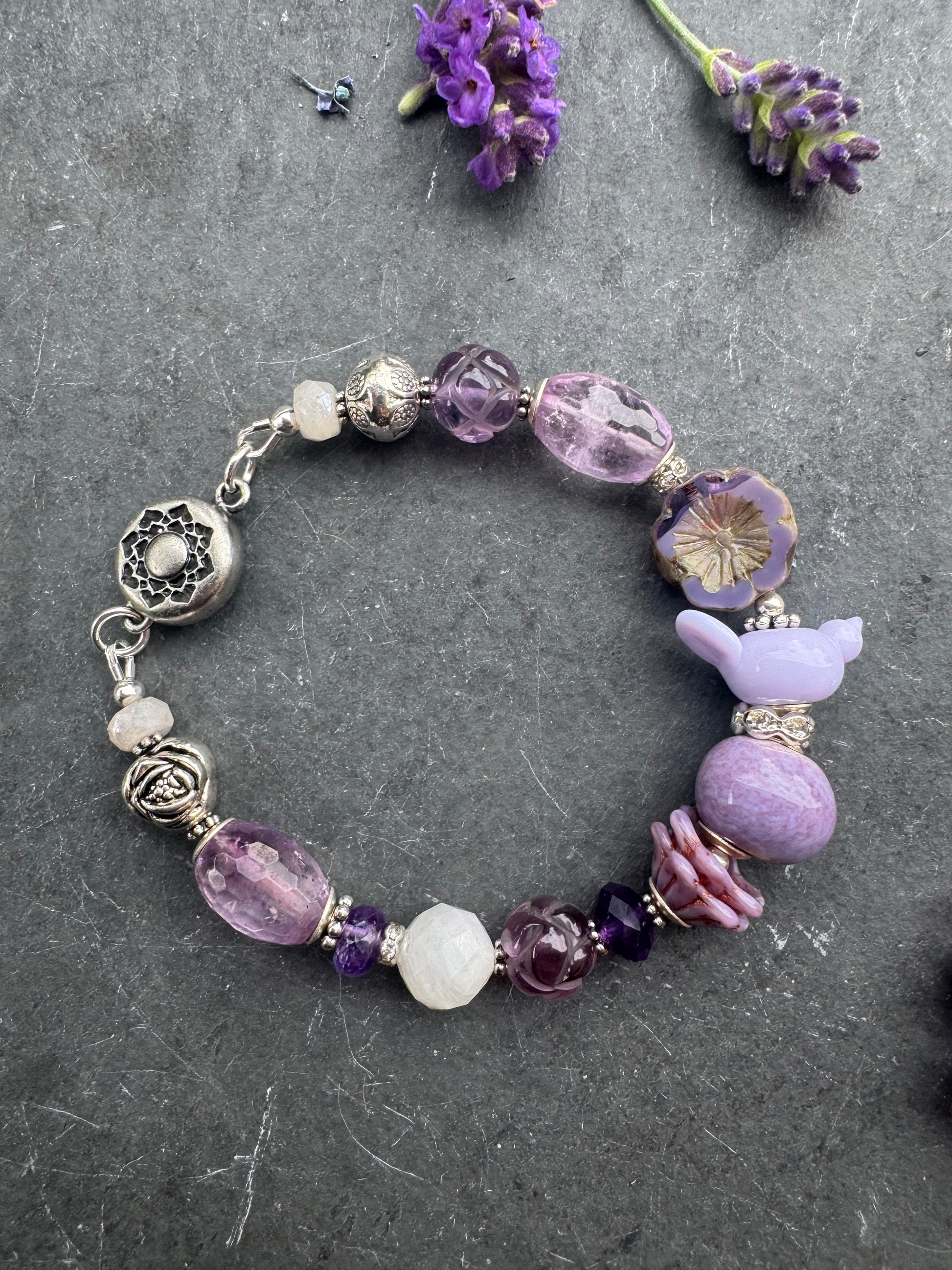 Amethyst stone, moonstone, lampwork glass bird, magnet clasp. silver metal, bracelet