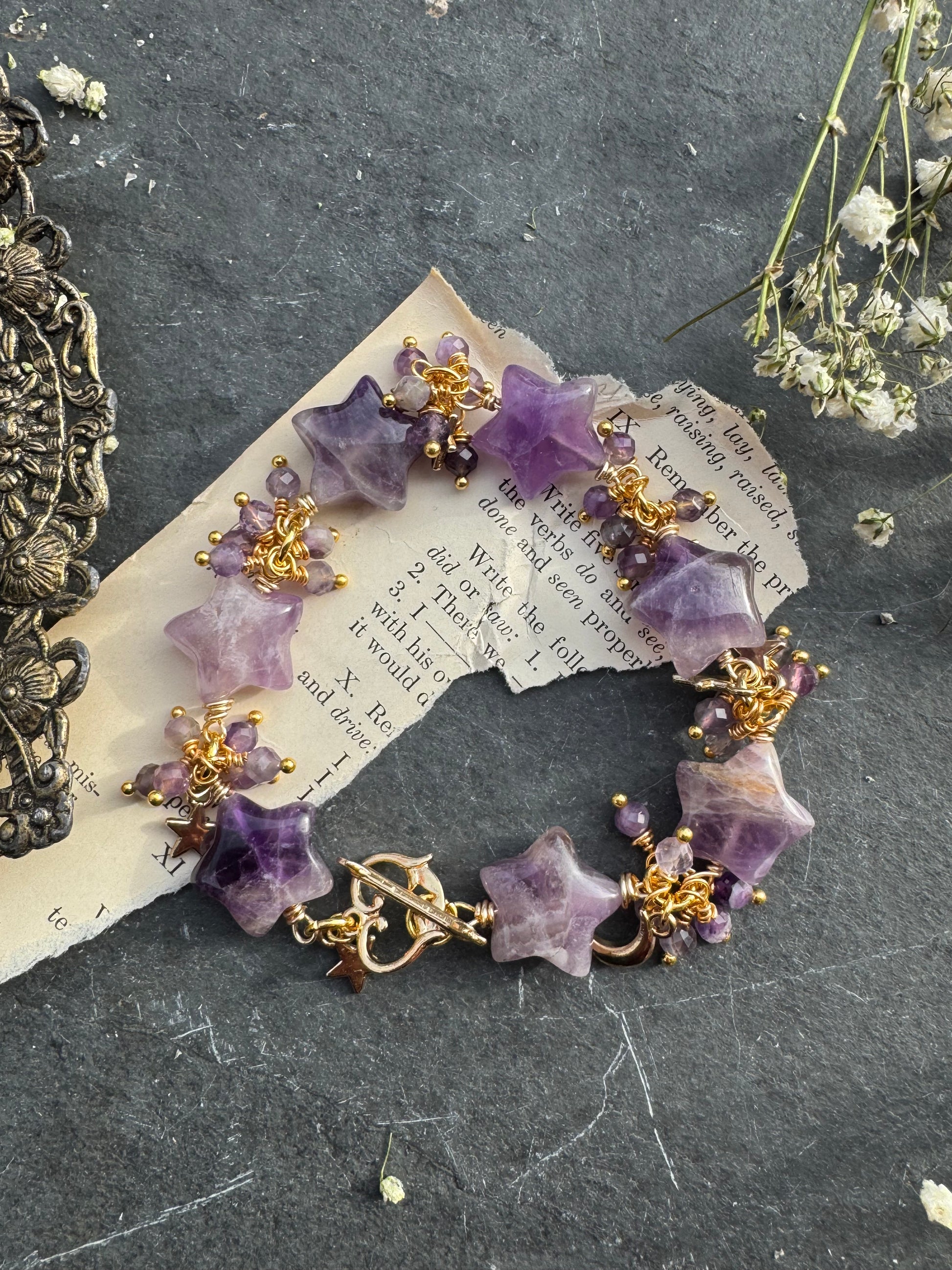 Amethyst stone stars, amethyst stone, gold metal, bracelet