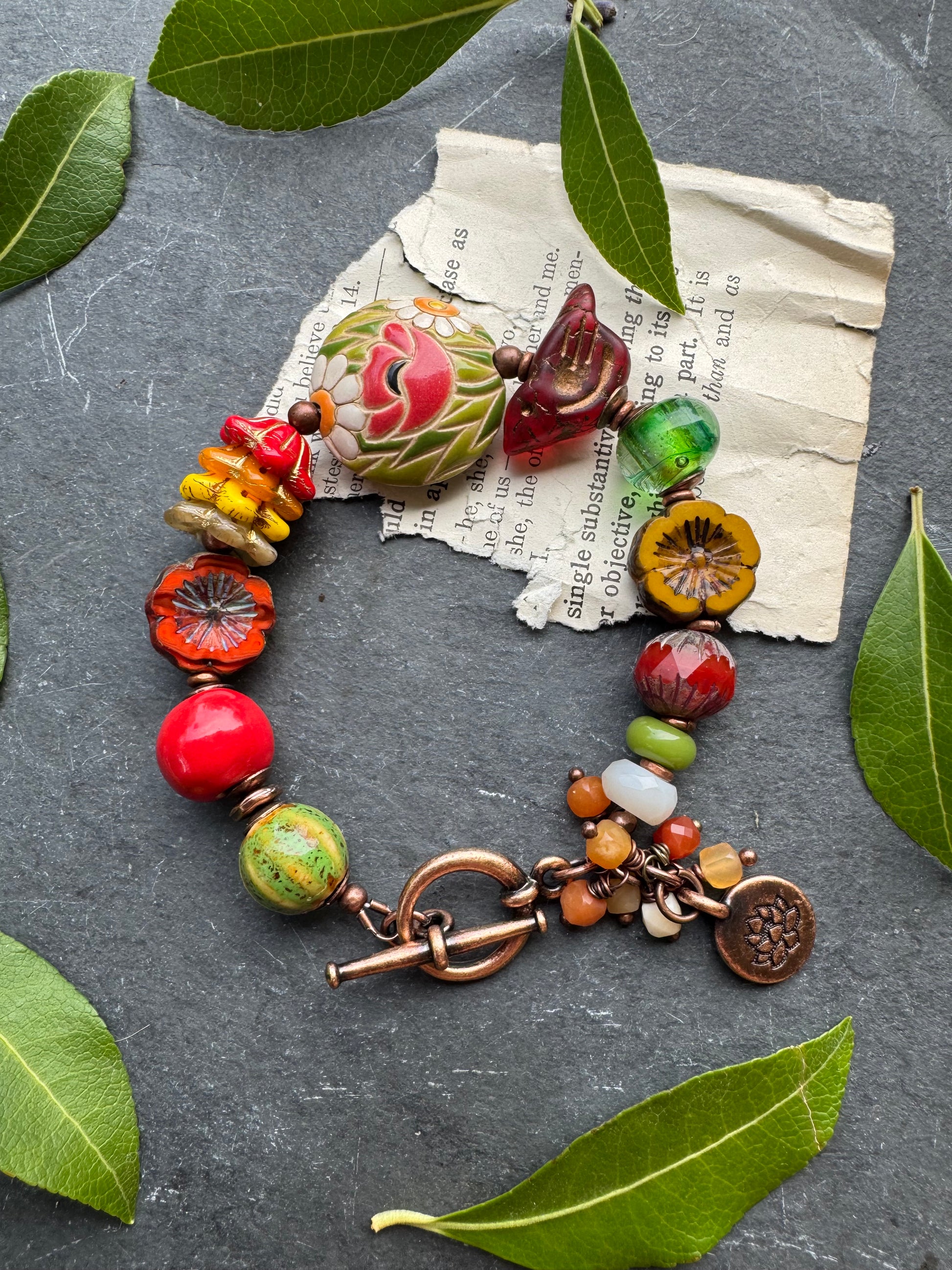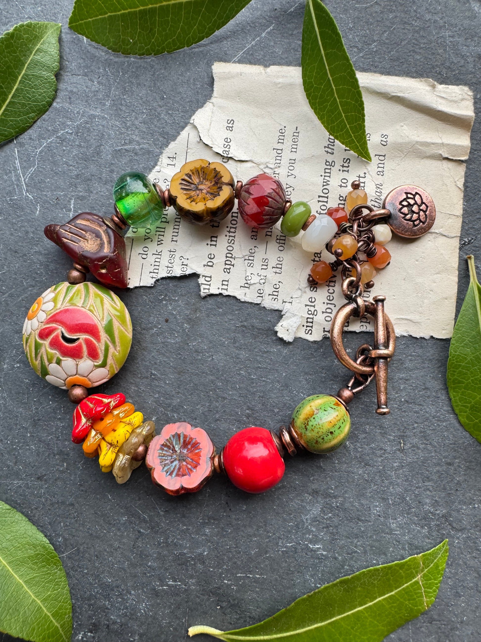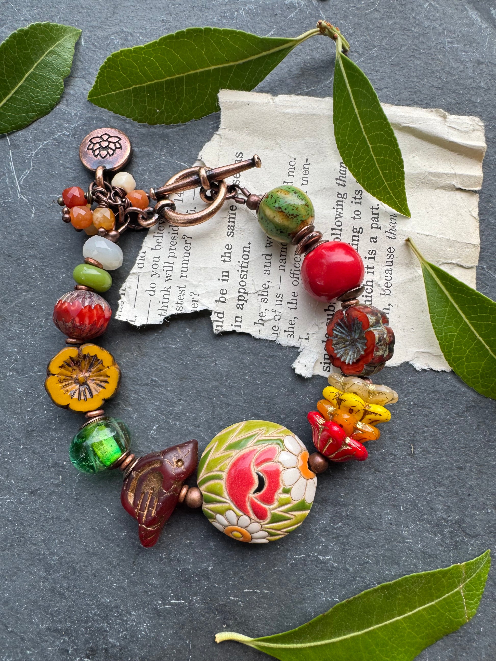 Bird. czech glass, lampwork glass, ceramic, copper metal.