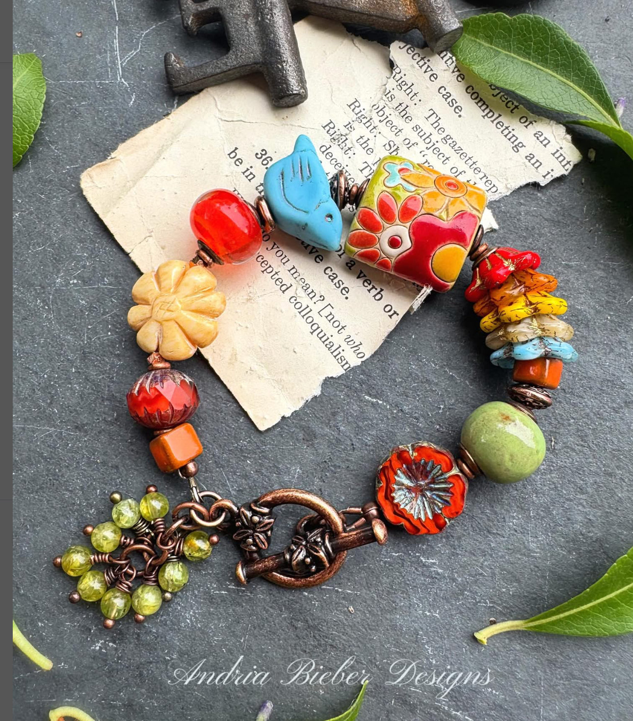 Blue Bird. czech glass, peridot stone, lampwork glass, ceramic, copper metal.