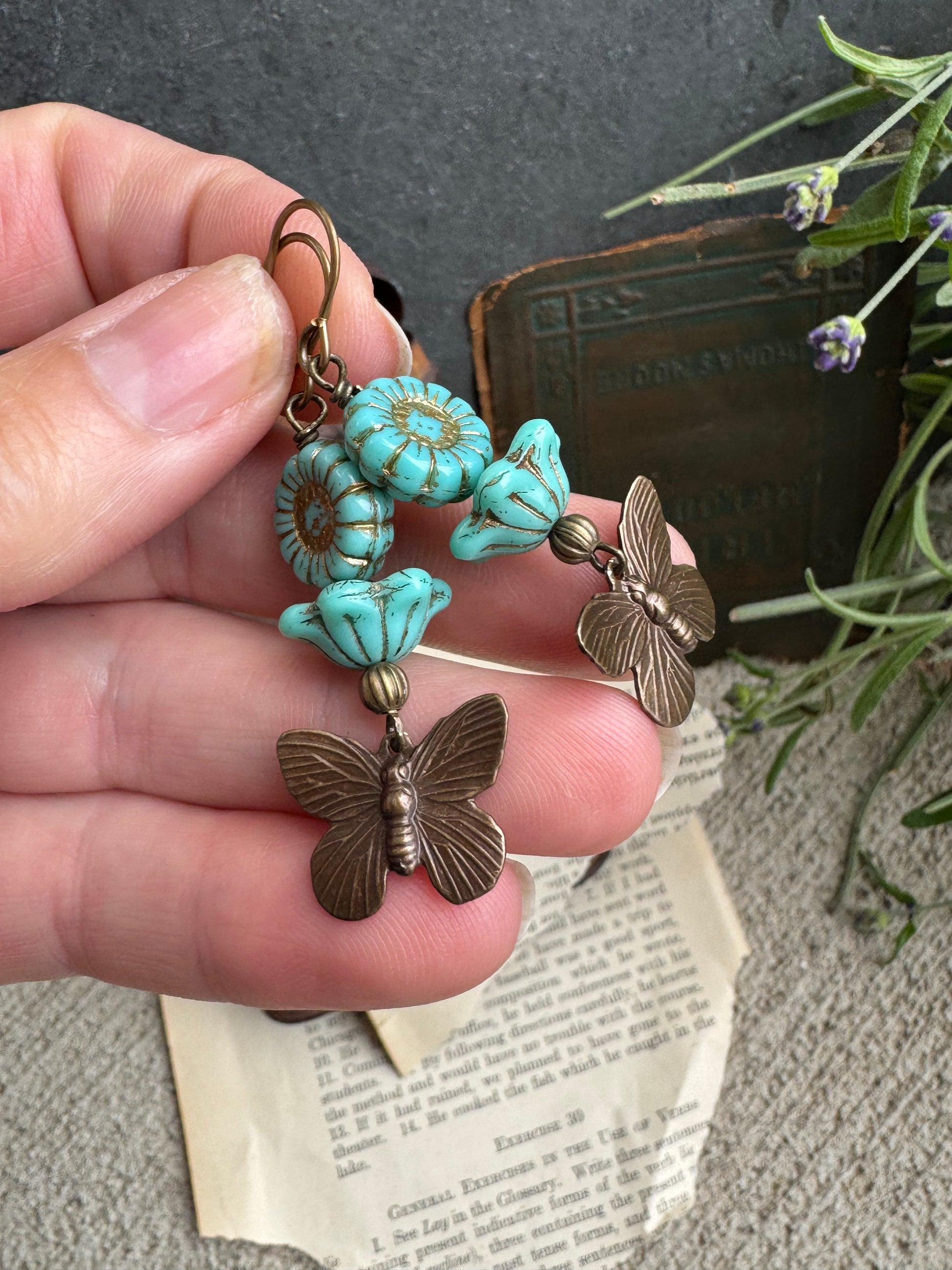 Butterfly Brass charm, turquoise Czech glass, earrings