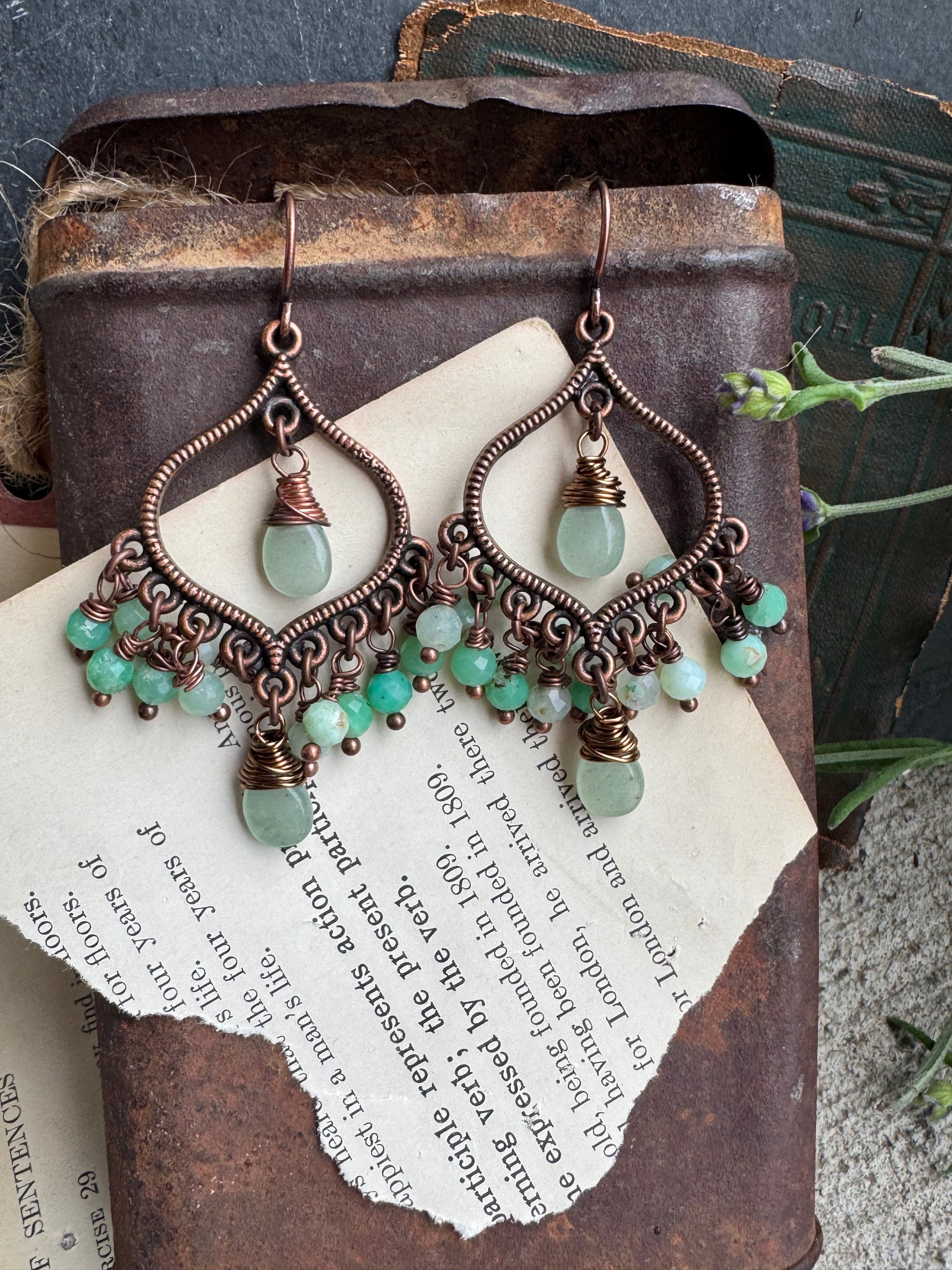 Chrysoprase stone, Drop detailed charms, copper earrings