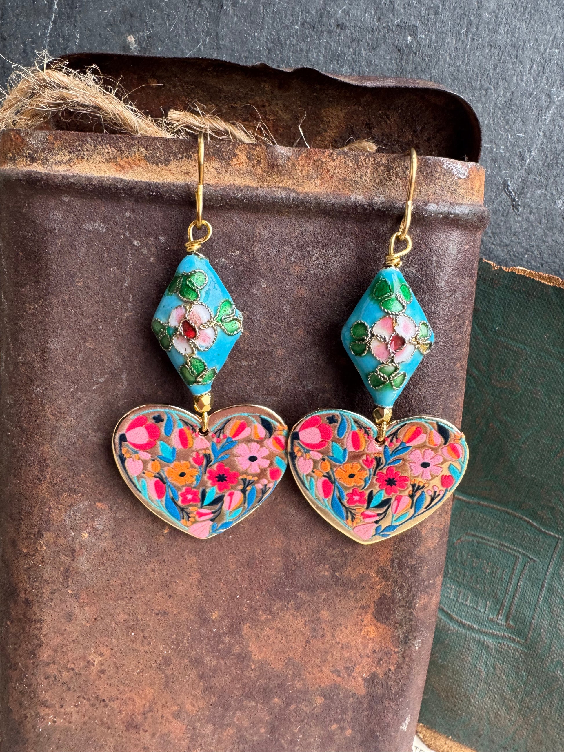 Enamel floral charm and floral cloisonné bead, lightweight earrings