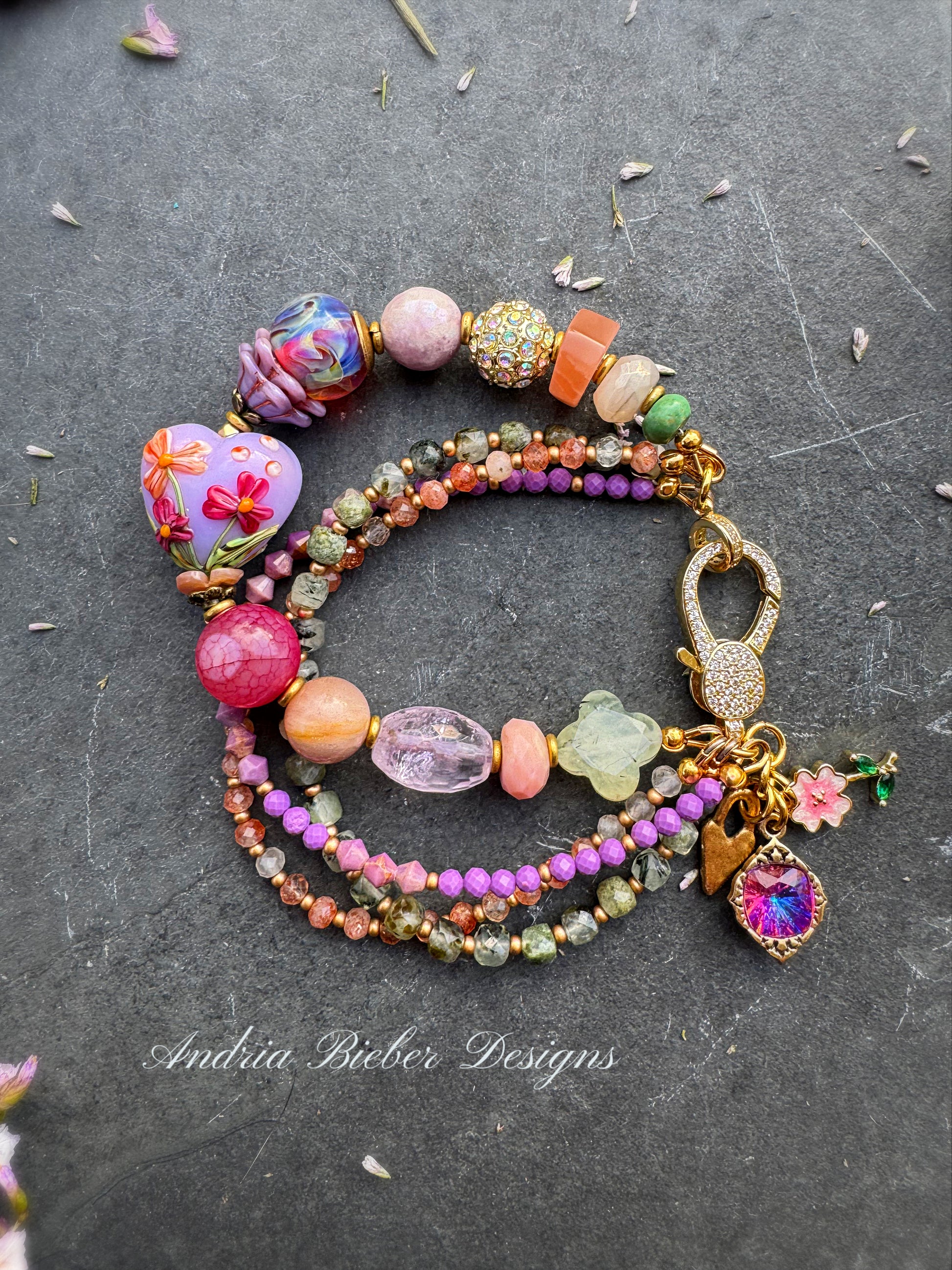 Lampwork glass, pink tourmaline, sunstone, amethyst, peach moonstone, pink agate, pink opal, prehnite, and with rhinestone clasp and charms