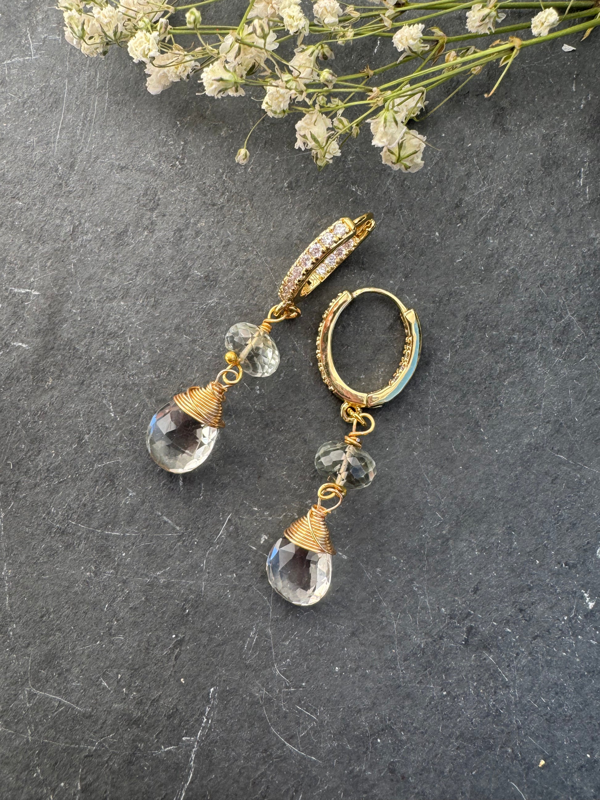 Green amethyst stone, gold rhinestone ear wires