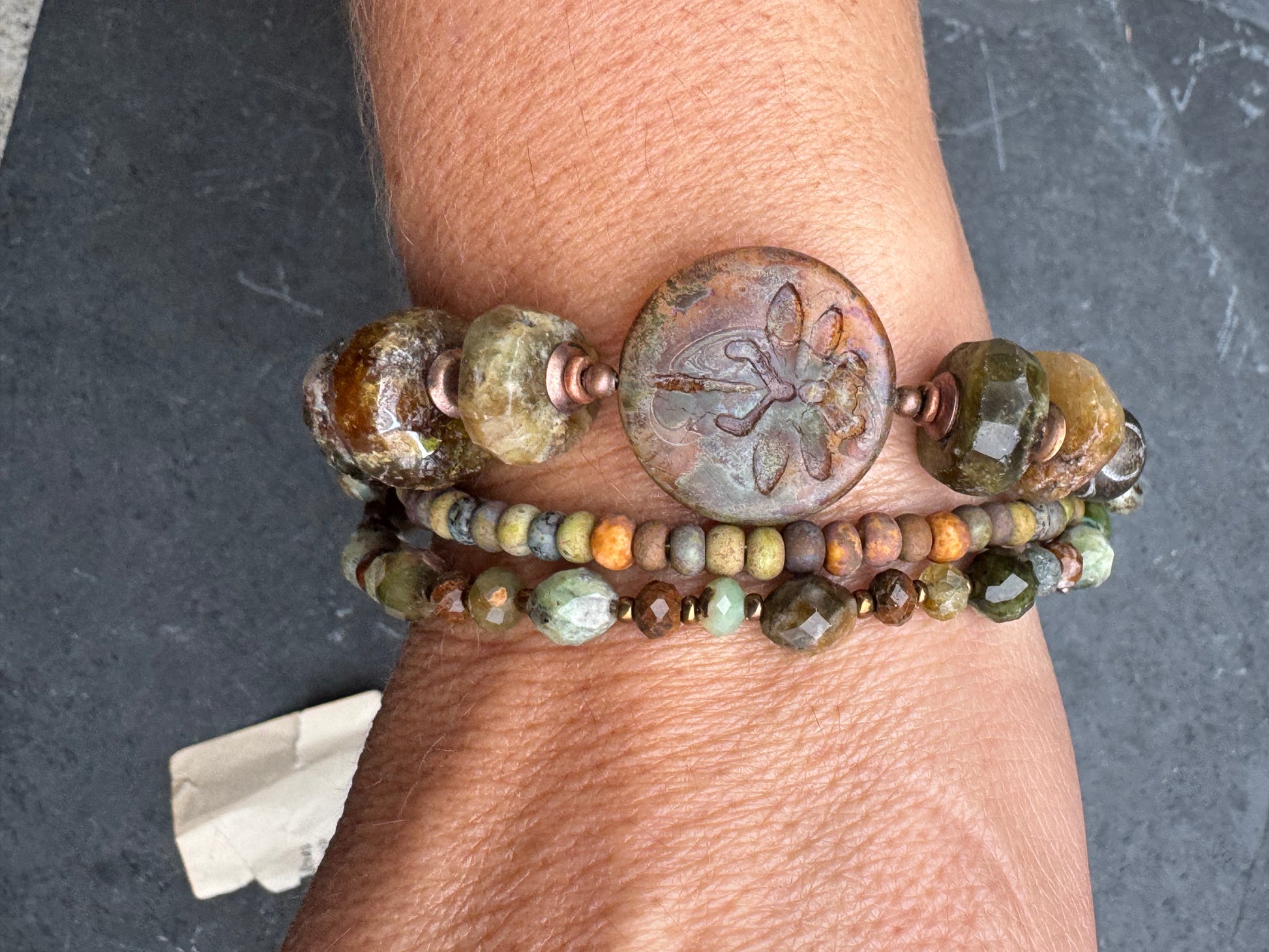 Green garnet, czech glass, Amazonite, African brass, bracelet