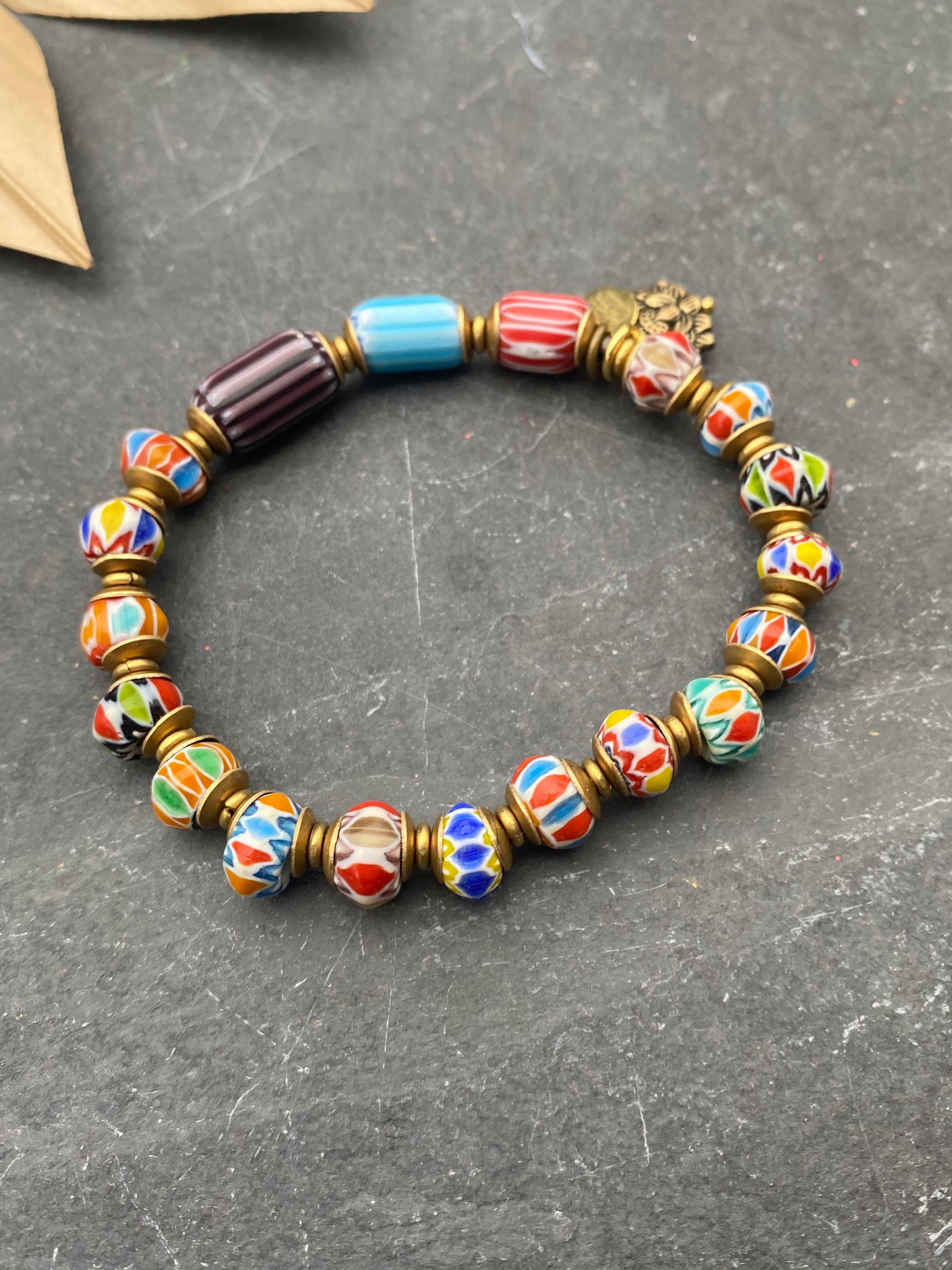 Indonesian glass, African brass, elastic cording, bracelet, jewelry